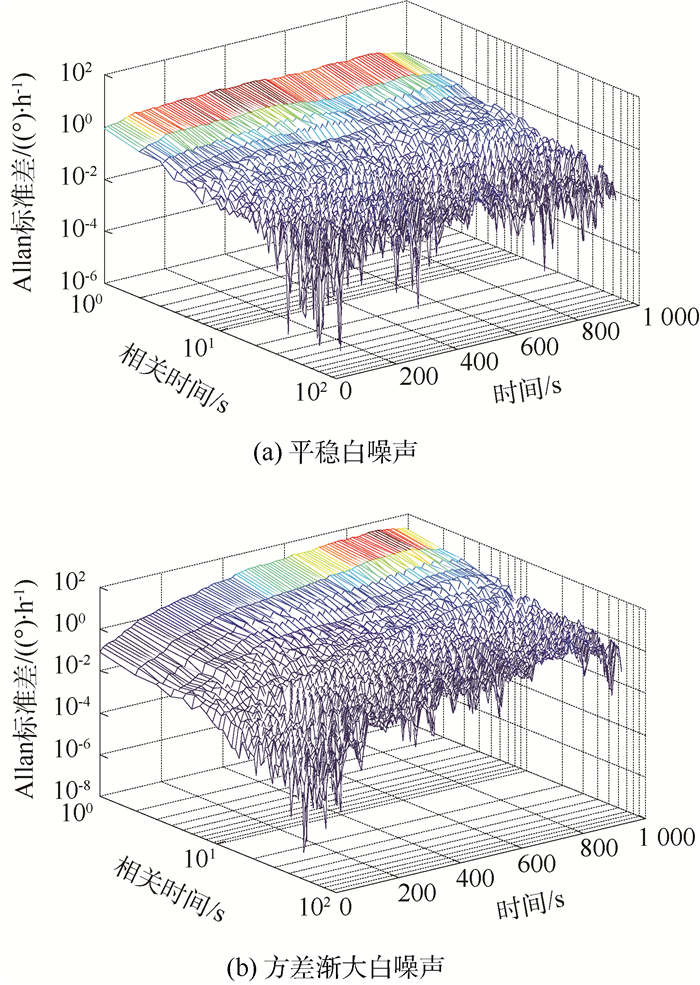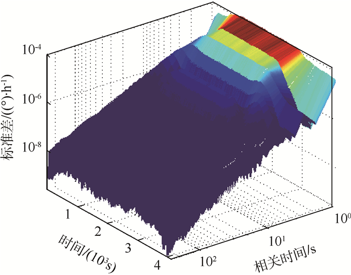 5)以此类推,重复上述过程,得到Allan方差值的集合{σA2(ti, τ)}(i=1, 2, …, n)和随机误差系数序列。以t和τ为变量,将Allan方差值的变化展现在三维分布图上,就得到了动态Allan分析的结果;将各时刻的随机误差系数在时间轴上展开,得到随机误差特性的动态变化过程。