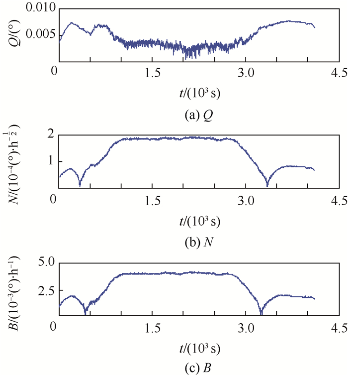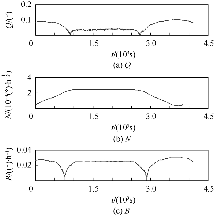 从图 7中可以看出灰度的变化,这是由于原始数据方差的变化引起的,说明动态总方差法可以跟踪信号的非平稳性变化。为了观察信号中随机误差组分的变化,分别使用动态Allan方差法和动态总方差法分析原始数据中的量化噪声系数Q、角度随机游走系数N、零偏不稳定性B,结果如图 8和图 9所示,图中t为时间。
