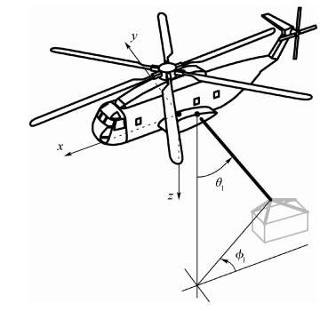 直升机本体的状态变量包括前飞速度vcg=[u v w]T(u、v和w分别为x、y和z方向速度)、姿态角θ=[φ θ ψ]T(φ、θ和ψ分别为滚转角、俯仰角和偏航角)和姿态角速度ω=[p q r]T(p、q和r分别为滚转角速度、俯仰角速度和偏航角速度),控制变量为u=[θom B′1 A′1θot](θom为飞行员的总距,B′1为纵向周期变距,A′1为横向周期变距,θot为脚蹬输入)。在直升机的体轴系内衡量吊挂位移的广义坐标即吊挂姿态角,如图 1所示。图中,θl和φl分别为吊挂物的后摆角和侧摆角。记吊挂姿态角θl=[θl φl]T,吊挂姿态角速度ωl=