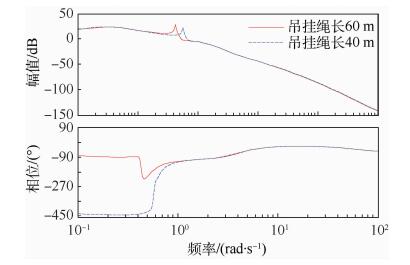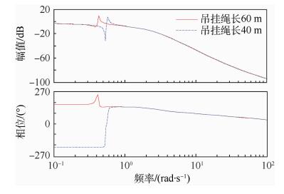 本部分选取了直升机在吊挂物质量为4t、吊挂绳长分别为40m和60m时的算例。根据带宽定义分别画出了俯仰通道和滚转通道的幅相曲线,算例伯德图如图 2和图 3所示。根据规范要求进一步计算了带宽与相位滞后,数据如表 1所示。