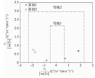由图 4可见,所有算例的总距-偏航特性指标均在等级2范围内。说明总距的操纵输入对偏航的角速度有一定影响。