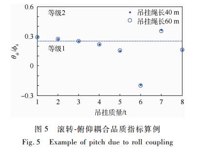 本部分选取的算例为前飞速度50m/s、吊挂绳长分别为40m和60m、吊挂质量由1t变化至8t的情况。结果如图 5所示,数据点全部在等级1和等级2的范围内,并且由数据可以看出相同的前飞速度和吊挂质量下,滚转-俯仰耦合品质受吊挂绳长的影响不大。综合而言,带吊挂闭环状态下的CH-53A/D的滚转通道对俯仰通道影响较小,能够达到比较满意的滚转-俯仰耦合飞行品质要求。