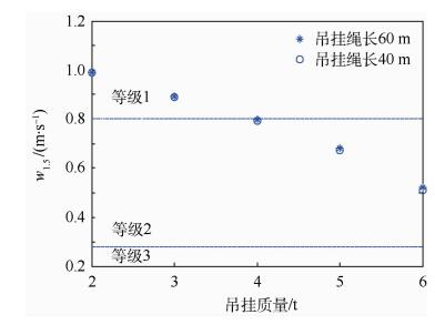 2.3.1 垂直轴操纵功效随吊挂质量变化本节取了2组算例,第1组前飞速度为50m/s,吊挂绳长为60m,吊挂质量由2t变化至6t;第2组前飞速度为50m/s,吊挂绳长为40m,吊挂质量也由2t变化至6t。所得到的w1.5均标注在图 6中。由图可见,随着吊挂质量增加,2组算例的垂直轴操纵功效品质等级均变差,吊挂质量为2t和3t的算例在等级1范围;吊挂质量为4、5和6t的算例在等级2范围。且同样的前飞速度和吊挂质量下,w1.5随绳长的变化关系并不明显。