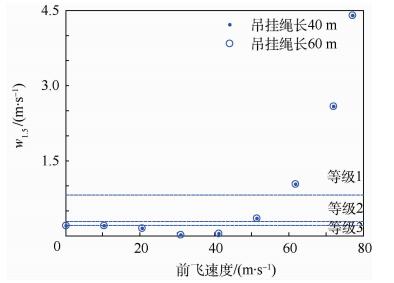 本节取的两组算例为吊挂质量8t,吊挂绳长分别为40m和60m,前飞速度单调递增的情况。所得到的w1.5均标注在图 7中。由图可见,随着前飞速度的增加,2组算例的垂直轴操纵功效品质呈现先变差后变好的趋势,在速度提高到60m/s后,垂直轴操纵功效品质均在等级1范围内。且同样的前飞速度和吊挂质量下,w1.5受绳长的影响并不明显。
