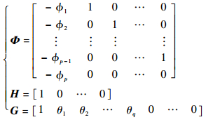 式中:状态变量选为x(t)=[x1(t)x2(t)…xp(t)]T,x1(t)对应ARMA过程的状态,系统噪声方差为Q=σe2,观测噪声方差为R=σv2;系统矩阵Φ、测量矩阵H和驱动噪声系数矩阵G由ARMA参数构成,如下: