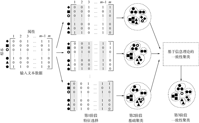 本文针对文本聚类提出了一种分解-组合算法框架——DIAS。首先通过采用简单随机特征抽样算法分解高维文本,得到多样化的结构知识,同时又规避了大量噪声特征的产生。然后基于信息理论的一致性聚类(Information-theoretic Consensus Clustering,ICC)将多视角基础聚类知识组合起来,得到高质量的一致性划分。