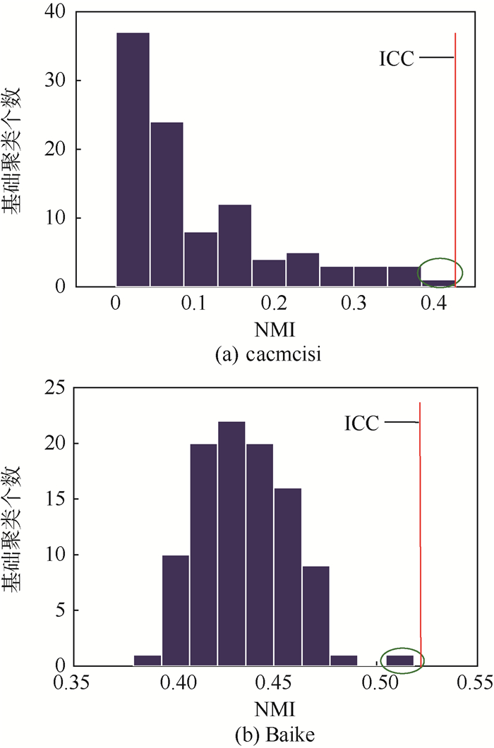 3.2 DIAS算法的影响因素分析 3.2.1 质量因素分析直观来看,基础聚类的好坏应对ICC算法的成功非常重要。问题在于需要多少个高质量的基础聚类才能得到一个好的一致性聚类。DIAS算法采用的简单随机特征抽样算法很难得到大量好的基础聚类。这一推测可以从基础聚类的质量分布中得到验证。从图 2可以看出,无论是cacmcisi还是Baike,大部分基础聚类的质量都比较差。关键在于ICC算法能否利用少量相对高质量的基础聚类得到较好的一致性划分。