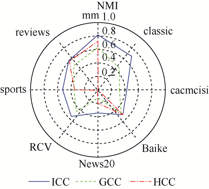 如图 7所示,ICC算法相较于其他2种算法具有明显的优势,在cacmcisi、classic、sports和News20这4个数据集上尤为突出。值得注意的是,HCC算法在classic、sports和RCV上表现较差。这表明HCC算法在实际运用中的健壮性不够好,并且其复杂度达到了Ο(n3),进一步阻碍了其在大规模文本数据集上的应用。相比于HCC算法,GCC算法表现得更为稳定和快速,但和ICC算法相比还是有较大的差距。