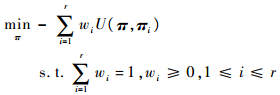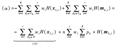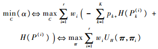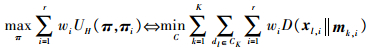 2 基于信息理论的一致性聚类令D表示文本数据集合,D=n。假设采用硬聚类划分将D划分成K个数据子集,用集合C={Ck|k=1, 2,…, K}表示,Ck∩Ck′=∅,∀k≠k′,∪k=1KCk=D。令向量π=(Lπ(d1), Lπ(d2), …, Lπ(dn))T,Lπ将文本dl映射到标签集合{1, 2, …, K}中,1≤l≤n。假设有r个基础聚类Π={π1, π2, …, πr}。目标是找到一致性聚类算法以求解下述问题: